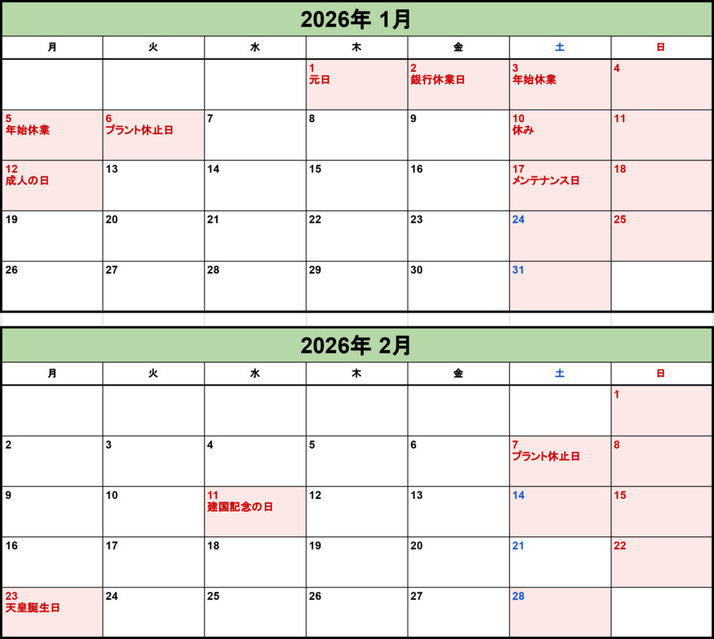 2026年 1月、2月のプラントお休みのお知らせ 2025年12月15日 いつも竹花工業株式会社 小諸生コン工場をご利用いただきありがとうございます。 2026年1月、2月のプラント工場お休みは下記の日程となっています。 2026年1月2月←こちらからPDFにてご覧いただけます。 第1、第3、第5土曜日ついては、佐久生コン組合の加盟工場が稼働している場合がありますので、お問い合わせください。 どうぞよろしくお願いいたします。