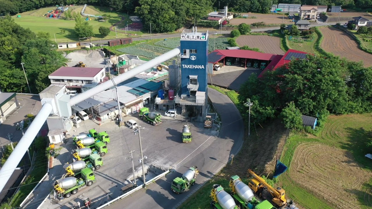 ミキサーで練り混ぜられた、柔らかいコンクリートをアジテータ車に積み込みます。